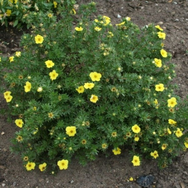 Квіти: численні, яскраво-жовті, не вигорають на сонці, складаються з п’яти пелюсток, по формі нагадують квіти яблуні.