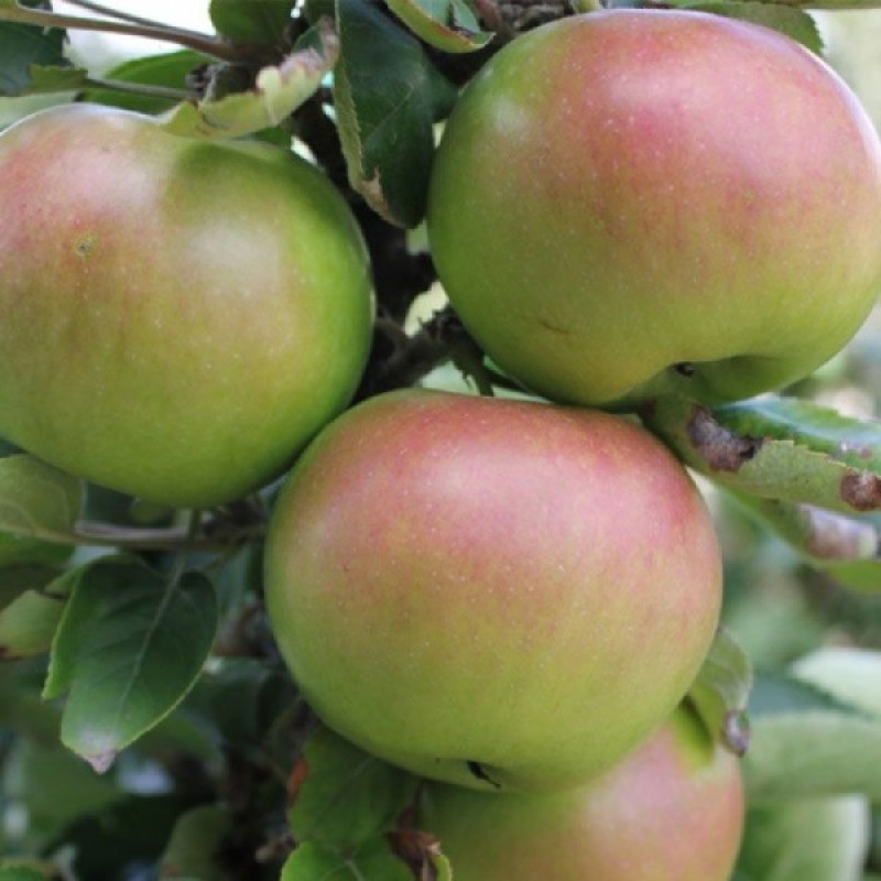 Плоди: невеликі, 100-120 г, одномірні, округлої, злегка подовженої форми. Яблука зеленувато-жовтого кольору з темно-червоним яскравим рум'янцем практично по всьому плоду.
