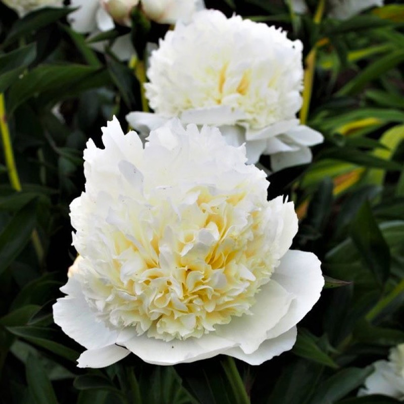 Цветение: крупные цветки диаметром от 10 до 15 см. Белые махровые лепестки формируют идеально круглую форму. Нижние лепестки больше и ровнее, а внутренние — плотно собраны в шар.