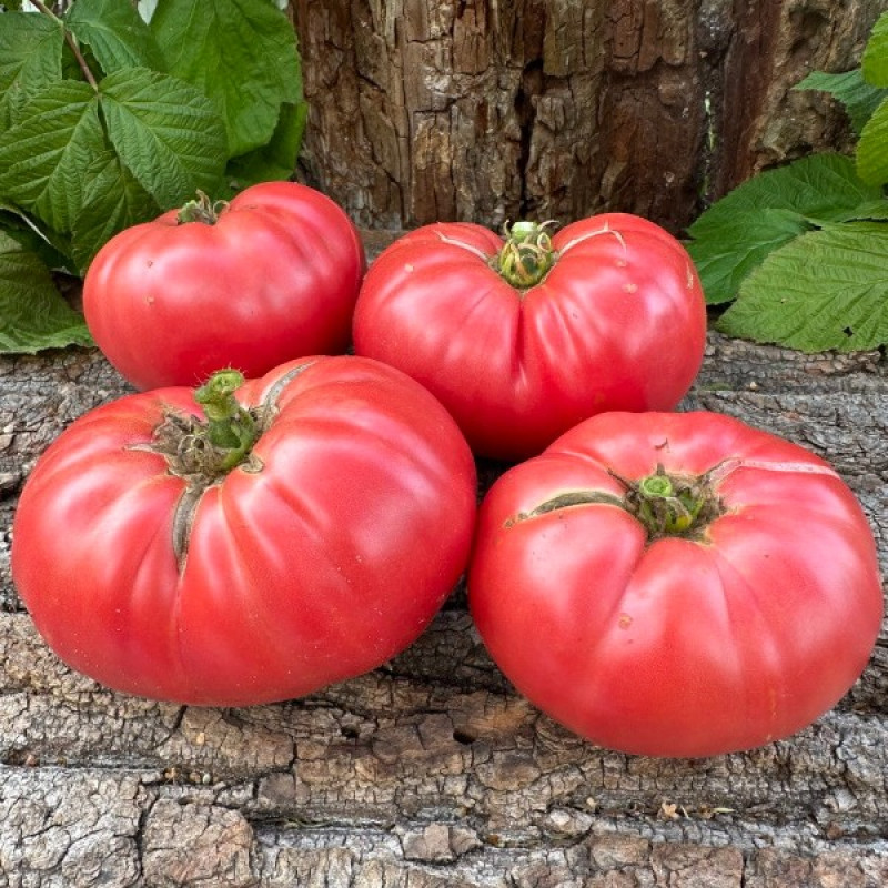 Плоды: большие, средний вес 200-500 г, плоско-округлые, насыщенного розового цвета, ребристые у плодоножки. Мякоть без жилок, многокамерная.